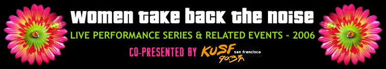 The Women Take Back The Noise Live Performance Series presents programs on Friday, December 8; Saturday, December 9; and Sunday, December 10, 2006 at 21Grand Arts Space, 416 25th Street (at Broadway) in Oakland. $10 at door or $25 for a 3-day pass. 3-day passes are available online or at the door Friday Dec. 8th at 21Grand, and Thursday Dec. 7th at the Luggage Store Gallery (New Music Series). For a complete listing of all scheduled events, please see below. |