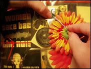 Here's another shot of the final phase of assembly (me holding up the flower and completed sound module once it's been attached and all the wires soldered and glued in place). I'm about to begin the last and most painful process of custom-fitting the modules into the vinyl purses and then attaching the flowers. Before I could attach everything, square holes were punched into the vinyl with a large-sized square hole punch so the power switch could stick out, and then a second set of smaller holes had to be punched in order to pull the LED's and screws through. The final step was adding the flowers and then screwing the metal spikes into place. As you can probably tell, there was a lot of fiddling around with pulling the modules in and out of the pocket to make sure everything lined up (x 1000, then x 1000 again, rinse and repeat...)