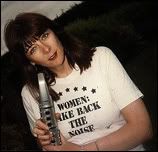 Cosey Fanni Tutti models the original 'Women Take Back The Noise' t-shirt (circa 1990, design by Robo)