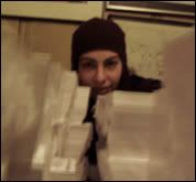 Hiding behind a wall of 25,000 artist cards on the day of their arrival...